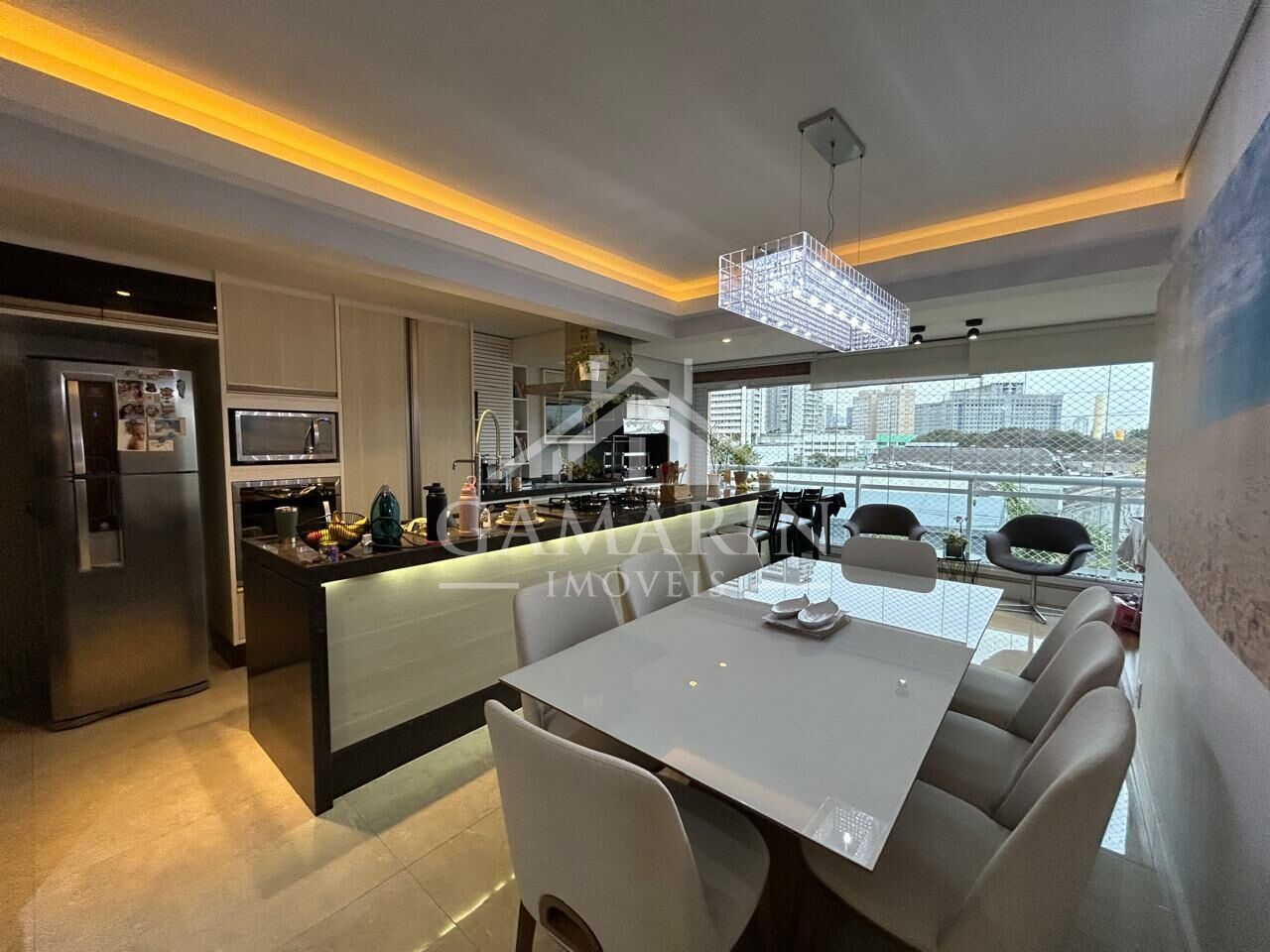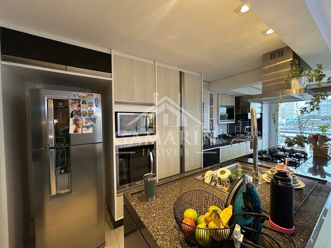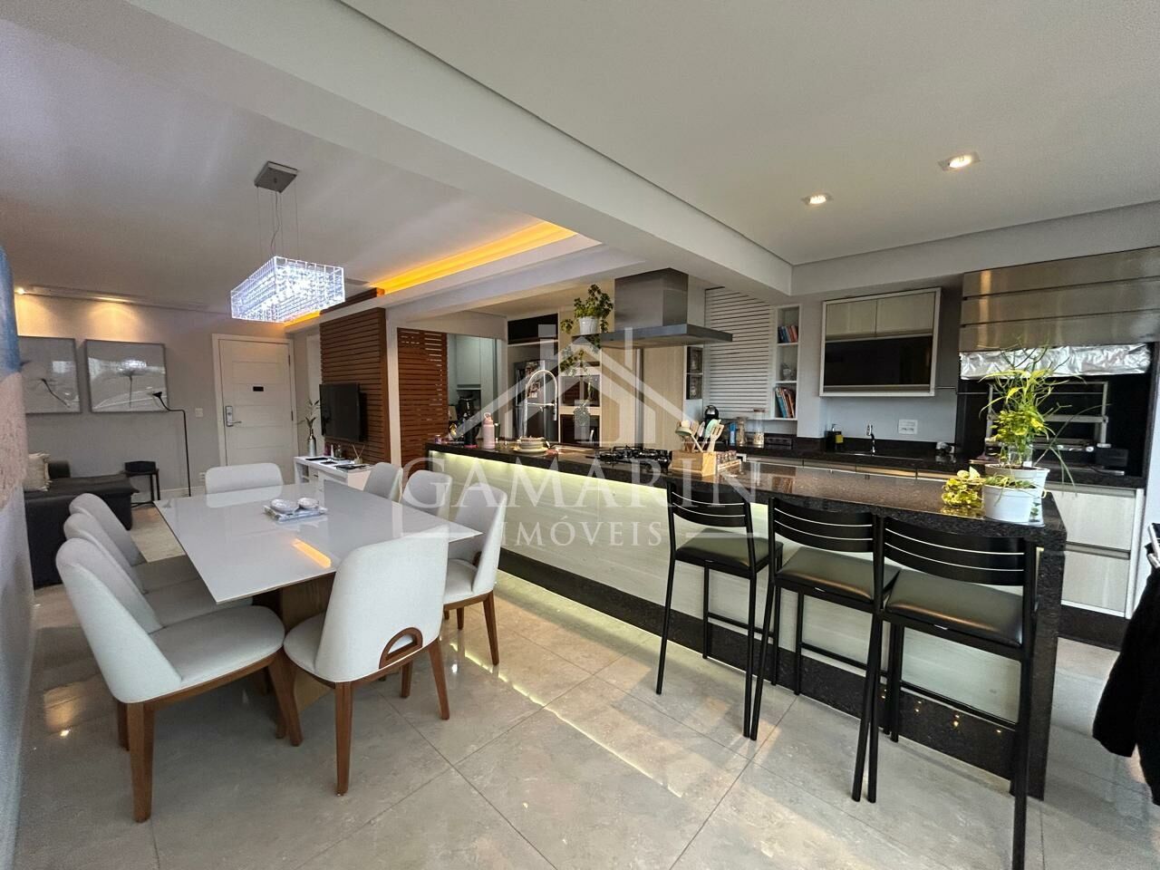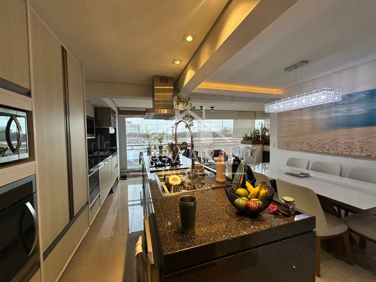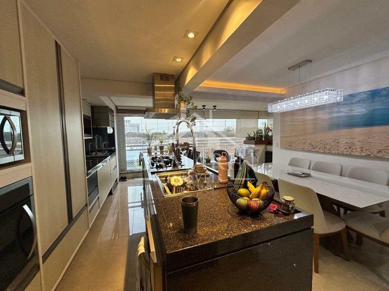- Cozinha americana com cooktop de indução, forno e micro-ondas embutidos;