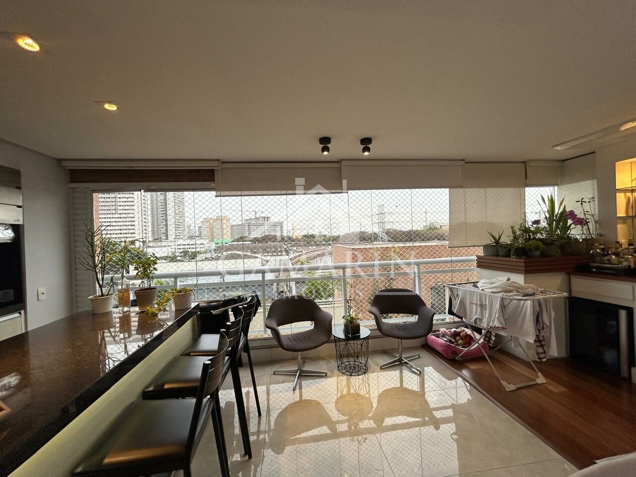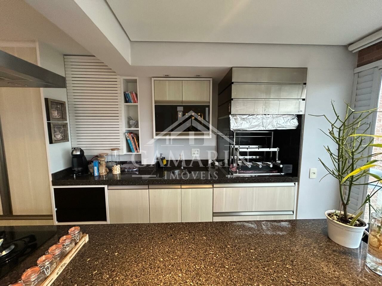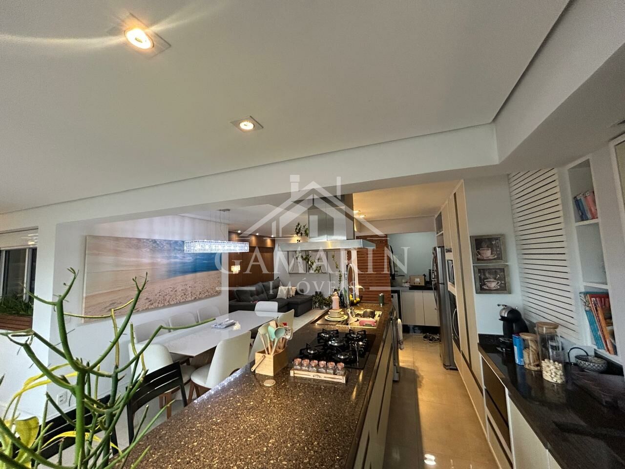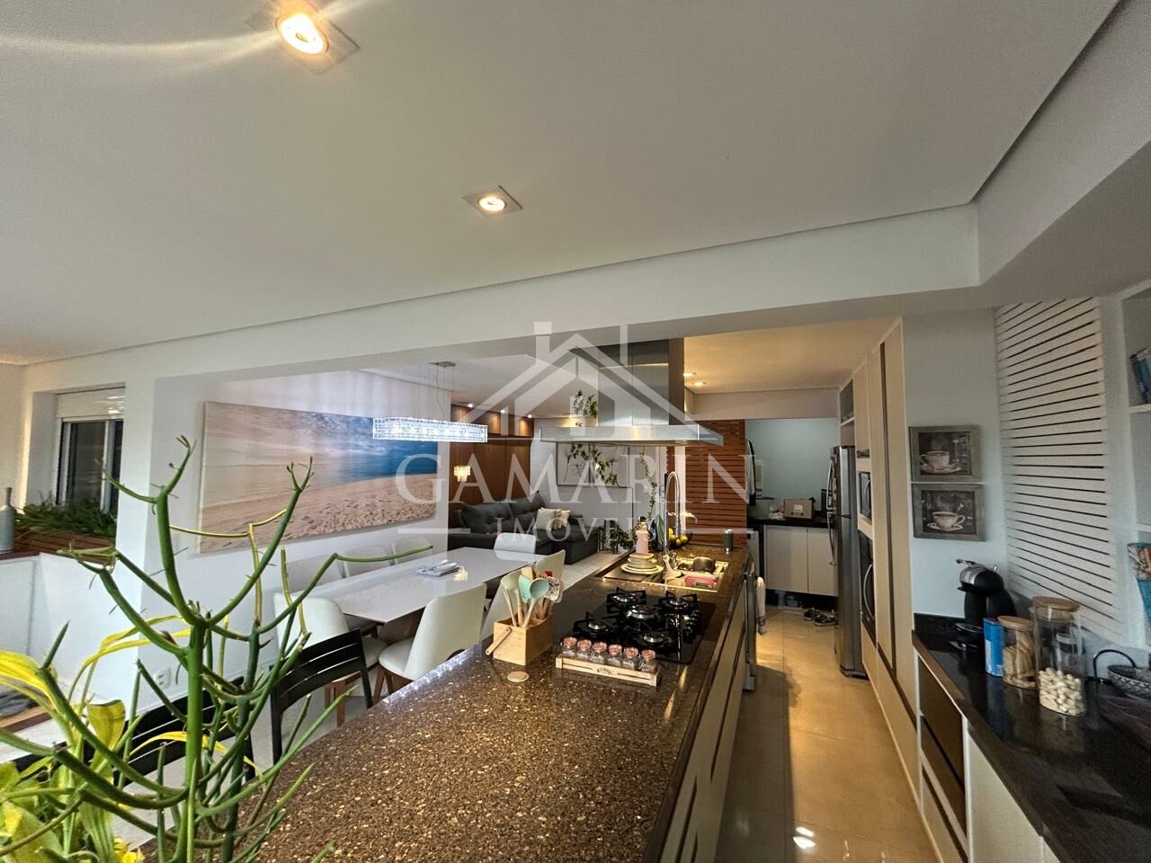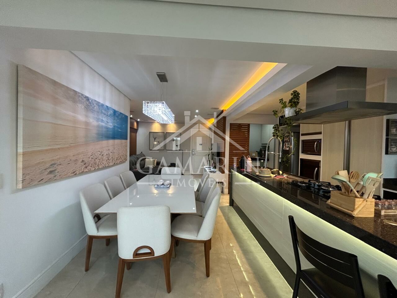 - Cozinha americana com cooktop de indução, forno e micro-ondas embutidos;